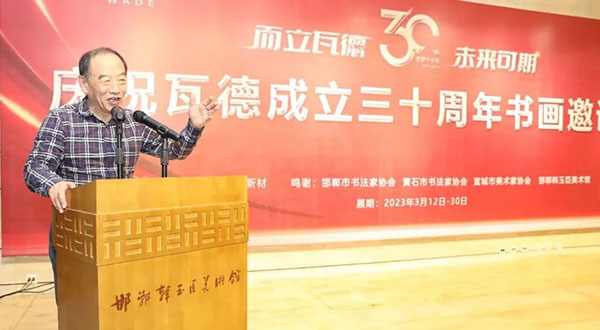 瓦德集團(tuán)董事長謝富強(qiáng)向與會的各路藝術(shù)家及賓朋表達(dá)了熱情歡迎。向河北邯鄲、湖北黃石、安徽宣城三地文聯(lián)、書協(xié)、美協(xié)和書畫家們的大力支持表達(dá)了衷心感謝。尤其對中國知名書畫家,邯鄲市書協(xié)主席,文化名人,著名企業(yè)家韓玉臣先生對瓦德集團(tuán)慶典活動的鼎力支持表達(dá)了深深的敬意和由衷地感謝。在三千年歷史的趙國都城邯鄲,能有瓦德集團(tuán)如此注重文化藝術(shù)的實屬難得,能將深厚的中國文化的脈絡(luò)注入到自己的企業(yè)產(chǎn)品中非常難得。